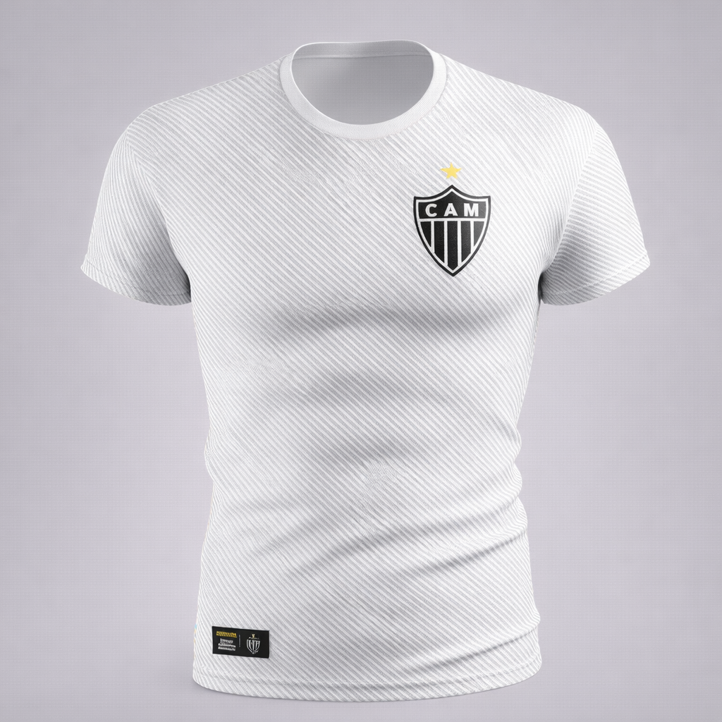 O design da Camisa Basic Galo Branca é um destaque à parte. O fundo da camisa é predominantemente preto, uma cor que traz um ar de elegância e seriedade. No entanto, é na estampa frontal que a peça realmente brilha. O escudo do Atlético Mineiro aparece em uma versão refinada, com detalhes em dourado que adicionam um toque de sofisticação e prestígio.