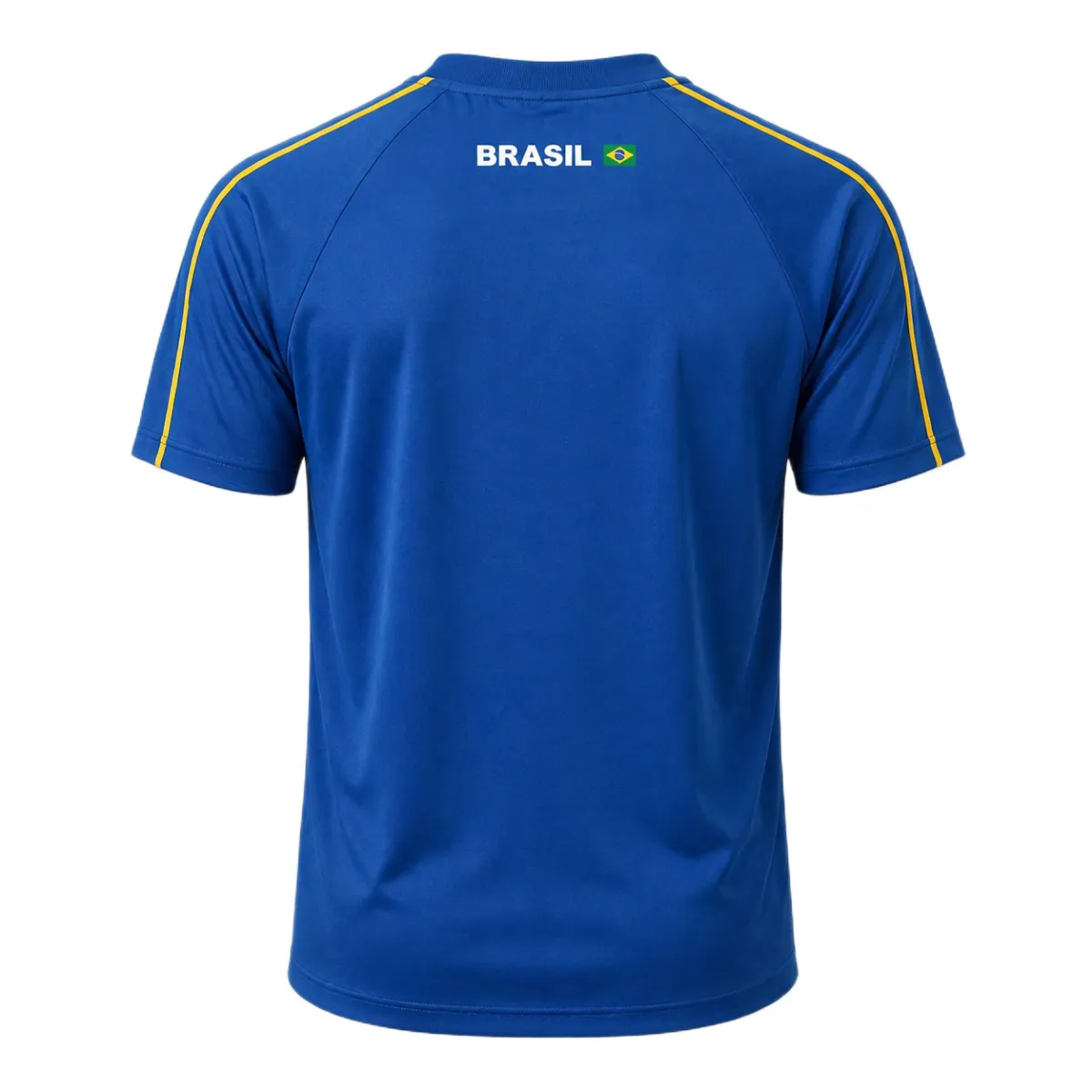 Confeccionada em tecido 100% poliéster, a peça oferece leveza, excelente respirabilidade e secagem rápida, garantindo conforto em qualquer ocasião seja para o dia a dia, momentos de lazer ou para demonstrar sua paixão pelo futebol. A gola redonda com acabamento reforçado proporciona ajuste confortável, enquanto o design raglan com recortes nos ombros valoriza o caimento e garante maior liberdade de movimento. Os detalhes em amarelo nos ombros e na parte superior criam um contraste elegante com o azul predominante, remetendo às cores da seleção brasileira.