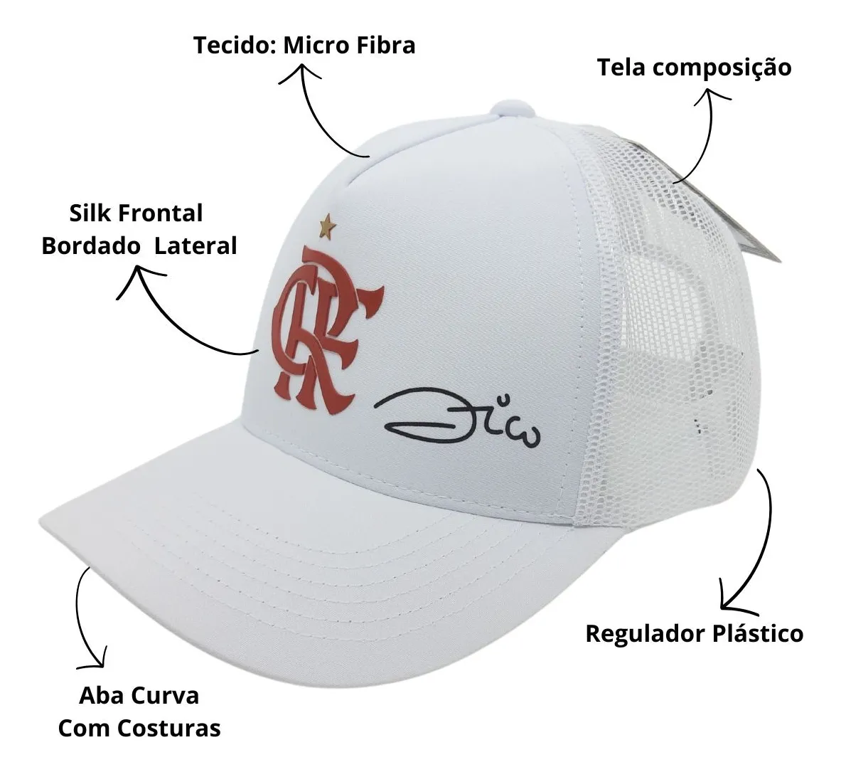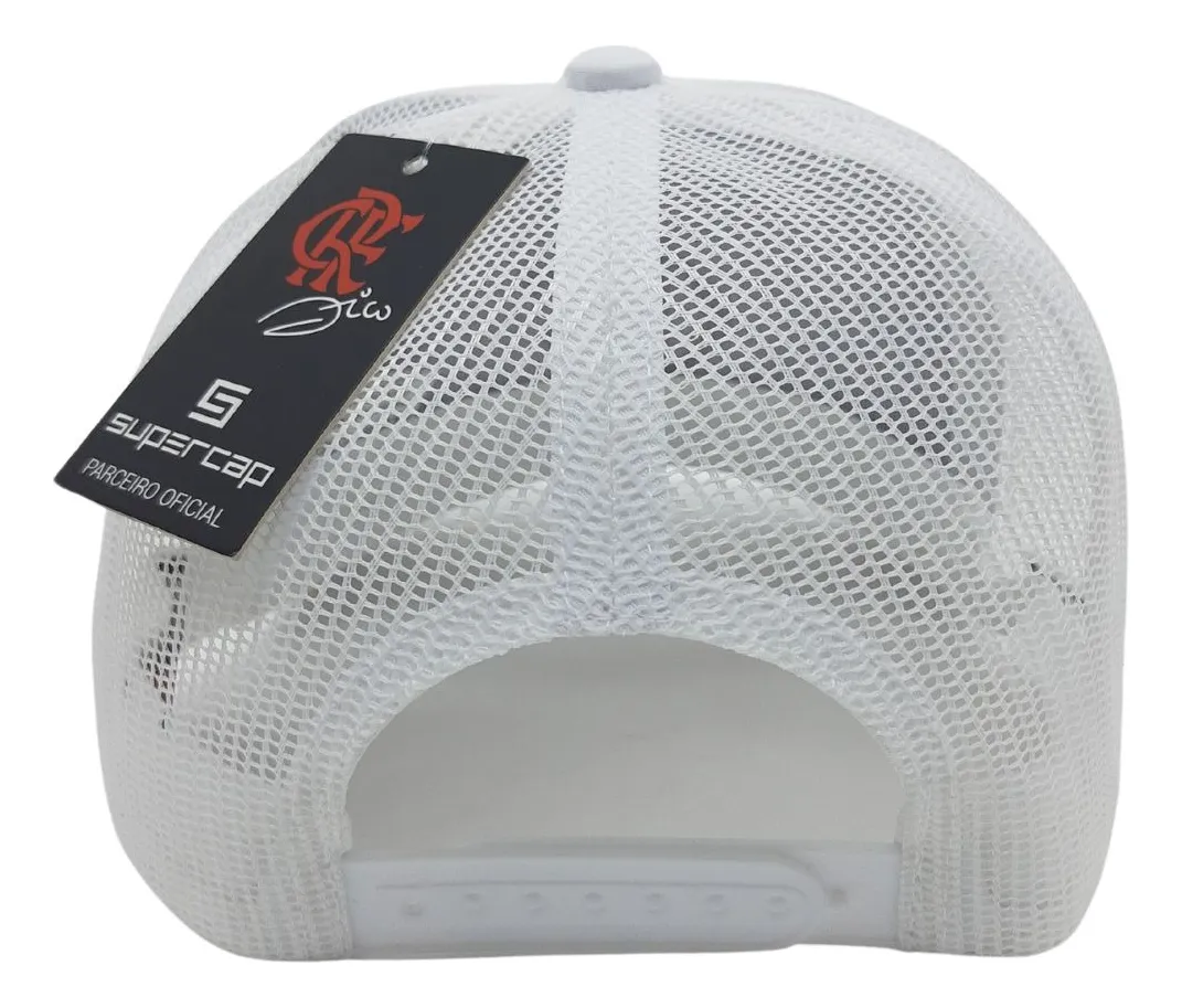Composição frente: 100% Algodão Composição tela: 100% Poliéster Cor predominante: Branco Ajuste: Pinos plásticos Peso aproximado: 90 g Indicado para: Casual Profundidade: 17 cm Origem: Nacional Escudo: Aplicado Clube: Flamengo Gênero: Unissex Aba: Curva Tamanho único