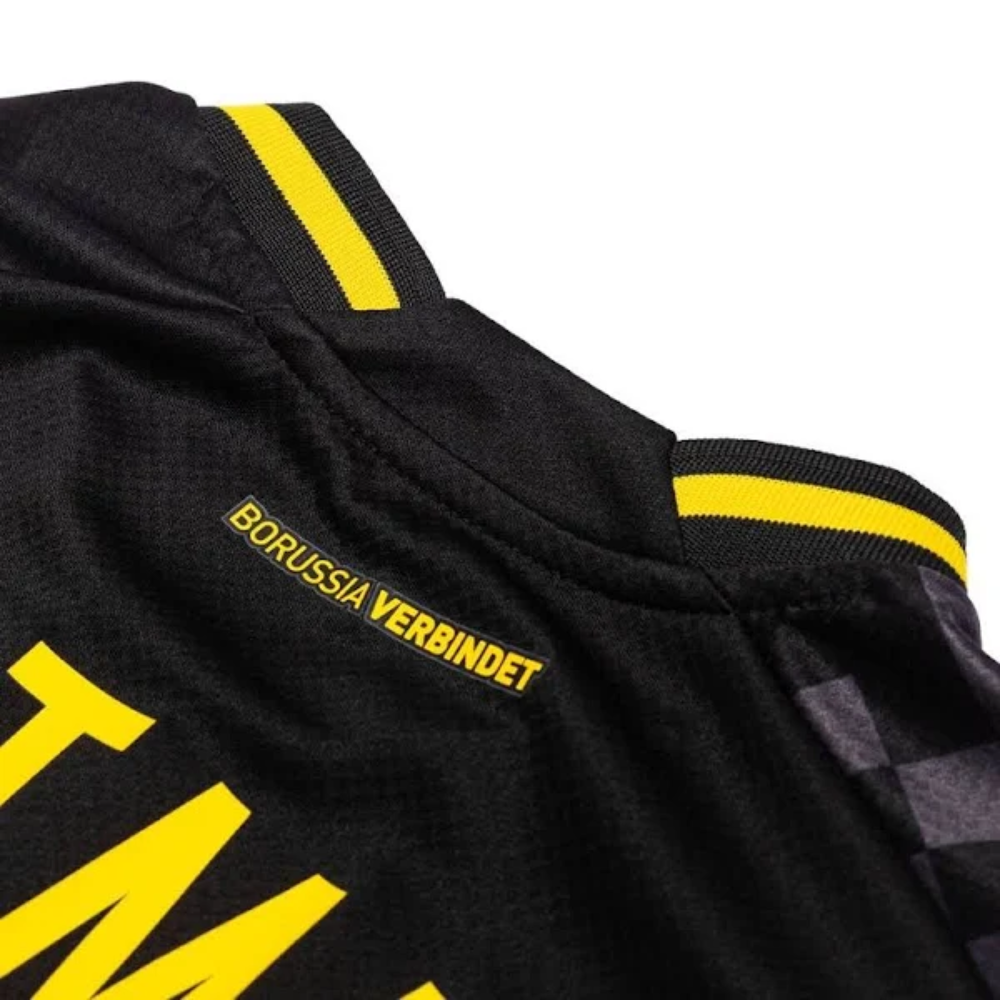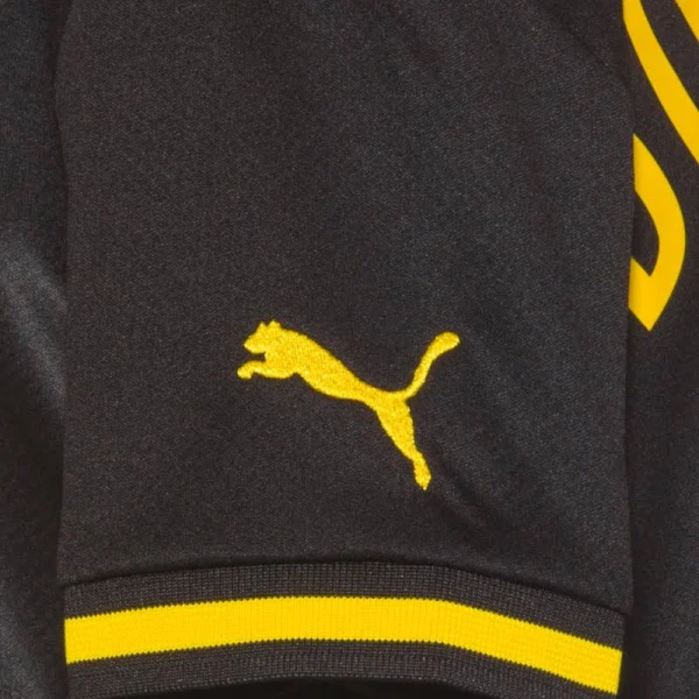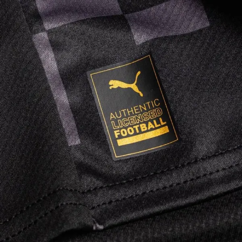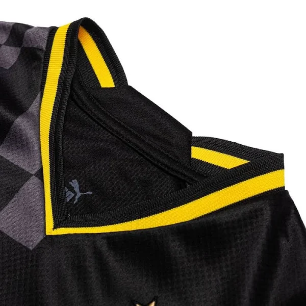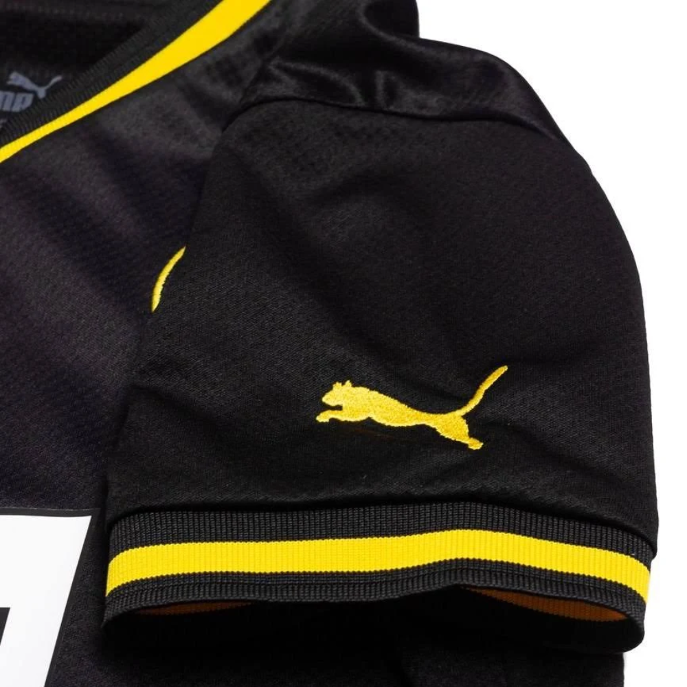 A camisa apresenta como cor predominante no preto, uma das cores mais emblemáticas do clube. Além disso, conta com detalhes em amarelo nas mangas e gola, o que proporciona um contraste visualmente atraente. O escudo do clube é bordado no lado esquerdo do peito, juntamente com o logo da Puma, marca responsável pela fabricação.